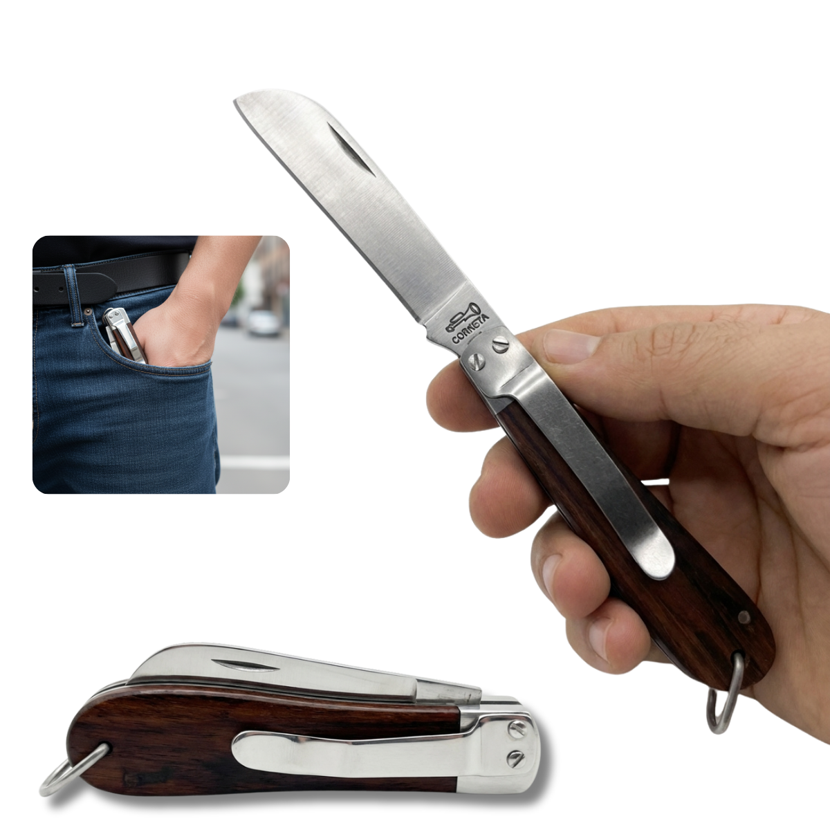 CANIVETE ESTILIZADO: Canivete foi desenvolvido com base em um projeto antigo da Corneta que nunca foi oficialmente lançado, tem como base a estrutura do canivete tipo eletricista 7063230 com o cabo sendo em madeira e a inclusão de uma presilha de bolso.